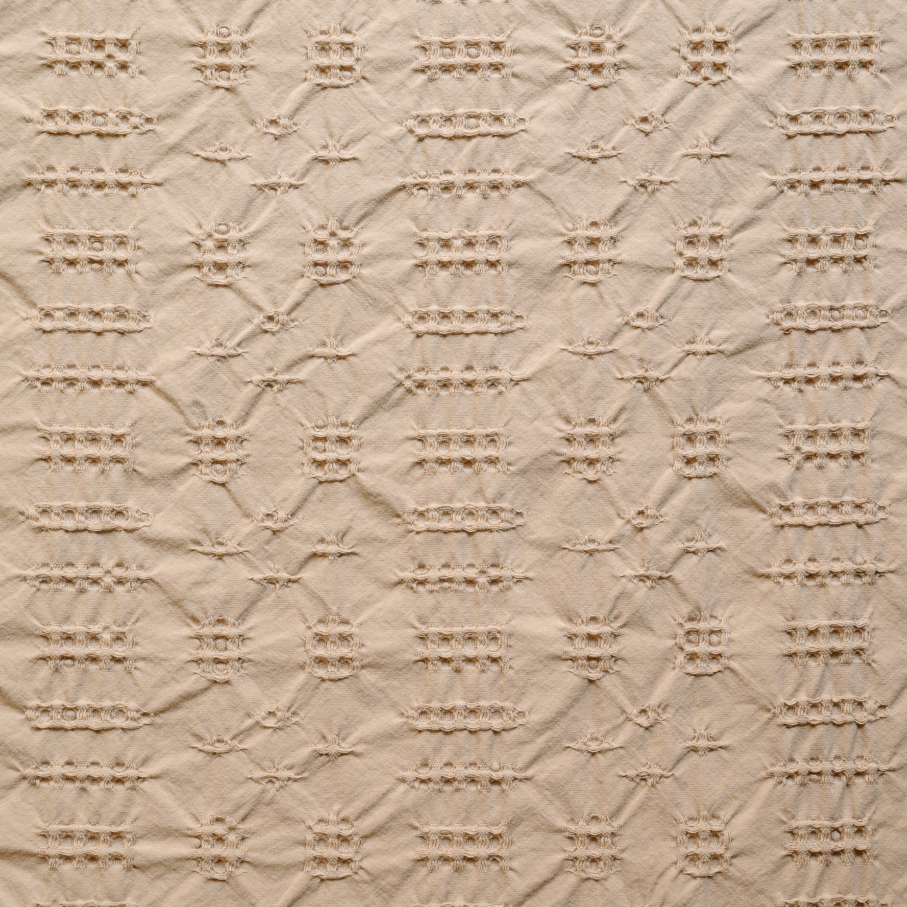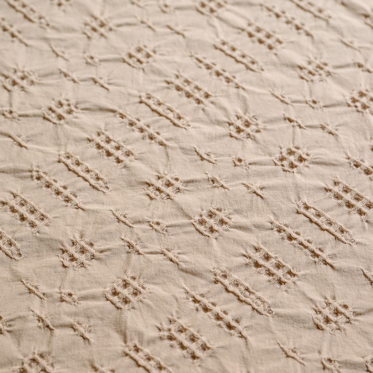 - Tejido base combinado con estructura nido de abeja, que aporta una textura irregular y tridimensional
